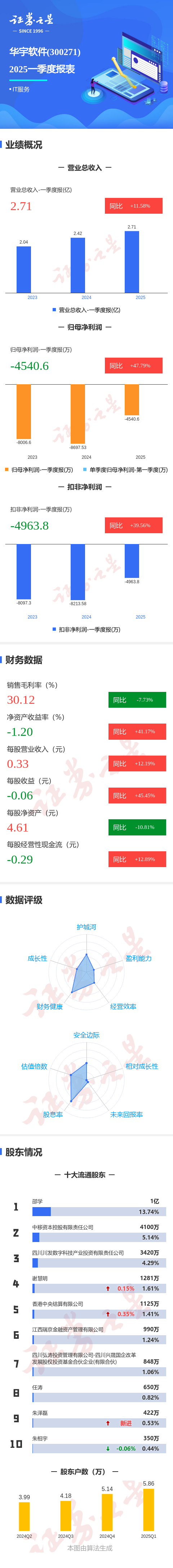 证券之星消息,华宇软件2025年一季报显示,公司主营收入2.71亿元,同比上升11.59%;归母净利润-4540.6万元,同比上升47.79%;扣非净利润-4963.8万元,同比上升39.57%;负债率17.56%,投资收益22.3万元,财务费用-1135.7万元,毛利率30.12%。